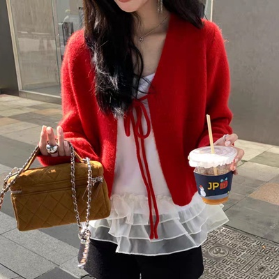 on.[CD611]리본스트링브이넥가디건